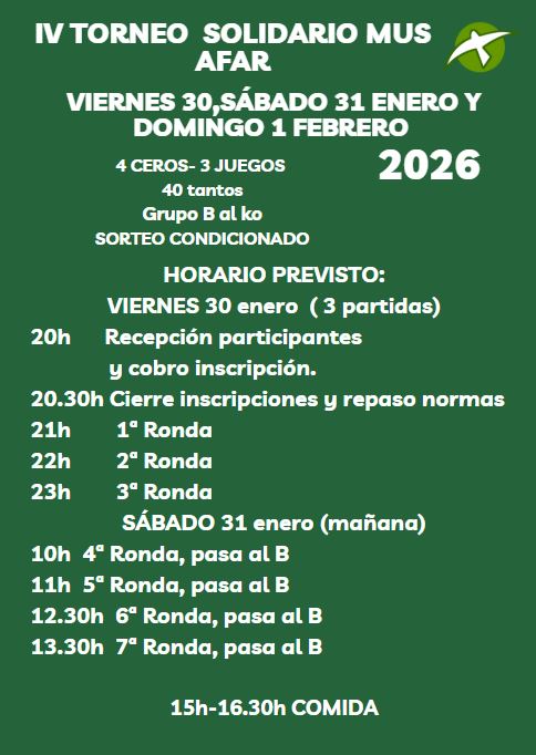 Los días 30, 31 y 1 de Febrero, en la Caseta Municipal del recinto ferial de Alcalá de Guadaira con apoyo de Voluntarios/as y Patrocinadores/as, se realizó el IV Torneo Solidario de Mus a favor de la Asociación AFAR.